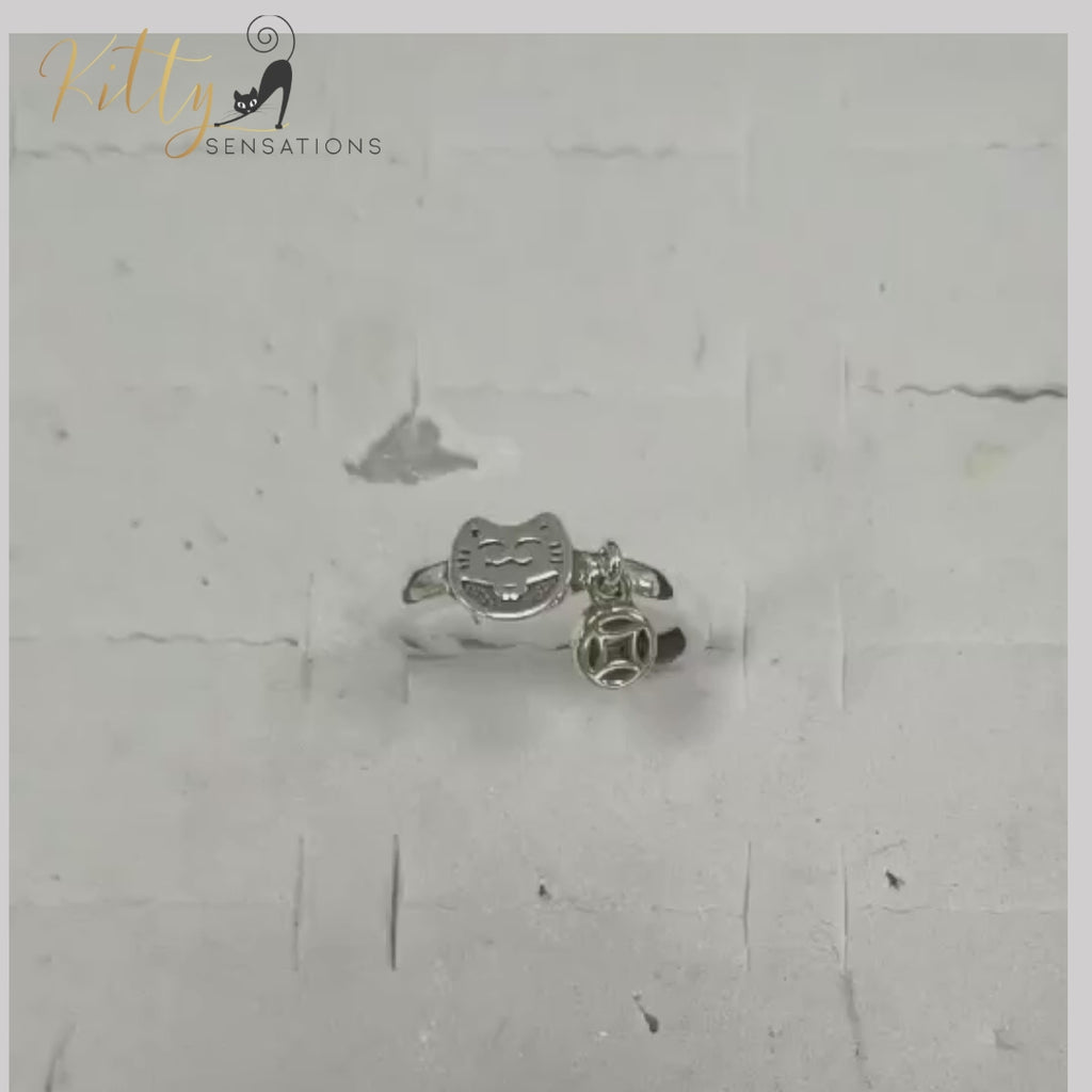 Smiley Cat Ring with Hanging Charm in Solid 925 Sterling Silver - Rhodium-Plated - Adjustable